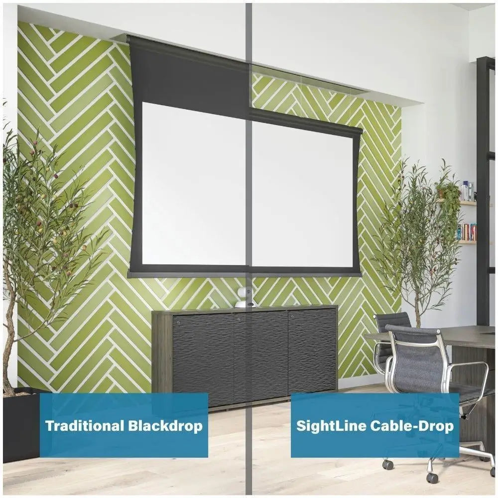 Jy kan die projeksieskerm tot die hoogte wat jy benodig laat sak terwyl die voorkoms van die kamer behoue bly wanneer dit uitgerol is, soos die argitek dit bedoel het. Die SightLine unieke kabelvalstelsel maak hierdie skerm die perfekte oplossing vir enige kamer met pragtige argitektuur of hoë plafonne.