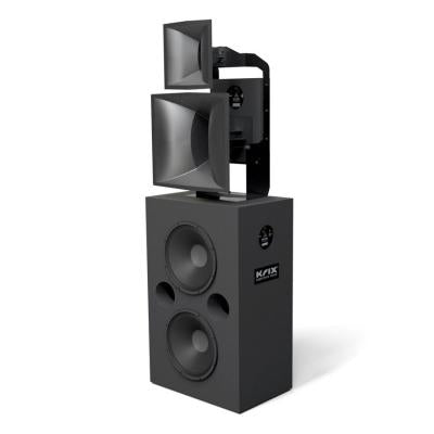 Die horingsamestellings word aan die baskas gemonteer met 'n stewige monteerbeugel wat beide vertikale en horisontale kantel bied. Die elektroniese filternetwerk vir die horinggedeelte word in 'n aparte, goed geventileerde omhulsel gehuisves, wat aan die agterkant van die middelreeks-horing gemonteer is. Professionele gehalte, noue toleransie-komponente verseker dat die stelsel die hoë klankdrukvlakke hanteer wat goed opgeneemde musiek en films vereis. 'n Afsonderlike elektroniese oorkruisnetwerk word benodig tussen die basdrywer en horingelemente.